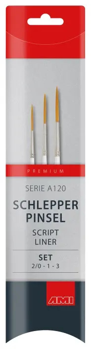 Set om 3 st linjedragare, storlekar 2/0, 1, 3.Runda konstnärspenslar med långt guldfärgat syntetiskt hår i en sömlös, silverfärgad klämma med en kort, vitblå målad skaft utmärkt för akvarellmålning och runt fina, långa och svängiga linjer.
